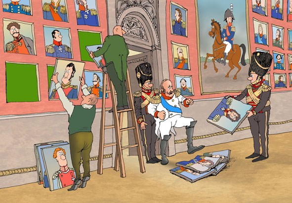Посетители Эрмитажа, приходящие в Военную галерею в Зимнем дворце, обращают внимание на пустые рамы, затянутые зеленым репсом, и тут же находят простое объяснение этому – портреты взяли на реставрацию. Более «продвинутые» считают, что это отсутствуют портреты декабристов, снятые после событий на Сенатской площади. Данная версия находит подтверждение даже в кинематографе. В известном фильме В.Мотыля о декабристах «Звезда пленительного счастья» (Ленфильм, 1975 г.) зрители видят, как дворцовые служители после ареста князя Волконского (замечательно сыгранного Олегом Стриженовым) снимают его портрет со стены в Военной галерее. В последнее время средства массовой информации стали невольно создавать еще одну версию, иллюстрируя сообщения о краже серебра из Эрмитажа изображениями пустых рам из Военной галереи.
