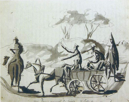 Сегодня мы, выступив задолго до рассвета, прошли 42 версты. Когда солнце зашло, мы были еще в пяти верстах от квартир. Я шел всю дорогу пешком — почему же я совсем не устал? Потому что идти было очень приятно и разумная беседа скрашивала долгий переход. Погода была прекрасная, наш полк шел один и поэтому очень быстро, мы довольно часто останавливались на привал, местность тут разнообразная. Вот почему я чувствую себя свежим, пройдя 42 версты. Предполагалось сначала сделать только 28 верст, но завтра будет дневка; к армии прибудет государь; ему понадобится 100 квартир, и нас отправили вперёд, дабы мы не занимали деревень вокруг квартиры его величества. Итак, хотя прибытие государя должно радовать его верных воинов, хотя он сам надеется доставить нам удовольствие, разделяя наши труды, на самом деле его присутствие приносит нам неудобство, и солдат вынужден проклинать его благие намерения.