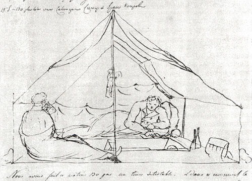 Когда началась моя бивачная жизнь, я не мог себе представить, как буду спасаться от дождя. Легкий ветерок казался мне бурей, и небольшое облачко на горизонте предвещало неизбежное посещение лекаря. Теперь я не боюсь даже самой суровой зимы, и когда мне грозит утрата многих удовольствий, я надеюсь найти новые. Меня влечет к себе уютный уголок в тесной палатке, у искусно сложенного за четверть часа очага, обед при свечах, среди снега и льда... Признаться ли? Я предпочту это унылой скуке зимних квартир...