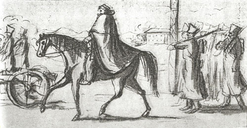 На берегу Немана перед ямой я столбом выстроился отряд в 600 человек, впереди стояли 16 лучших стрелков. Я оказался в толпе любопытных и заговорил с Вилье, когда услышал, что ведут преступника. Повернув голову, я увидел его в сопровождении стражи. Он опирался на руку своего духовника, читавшего молитвы. Перед ямой он остановился, исповедался, выслушал приговор и высказал свою последнюю волю. Наконец религиозная церемония окончилась, стрелки сделали шаг вперед, на него надели саван, подвели и привязали к столбу.