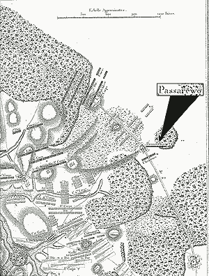 Крайний левый фланг русской позиции на «Плане Водонкура» (1815 г.), созданном на основе карты, изготовленной «по заказу» французской разведки офицерами Депо карт в СПб. Деревня Утица названа «Passarevo». Данные фальшивой карты – все об этой части поля, чем располагало французское командование накануне сражения.