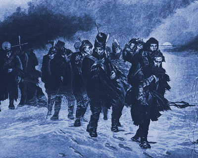 ![]() Многие пережившие русскую кампанию считали, что путь от Березины до Вильны был самым странным испытанием в их жизни, проверкой их человеческих качеств. По словам очевидцев, "более жестокого эгоизма, большего равнодушия к товарищам и даже друзьям" им не приходилось испытывать. Голод и нужда низводили одних "до состояния животных", других сводили с ума, третьих, лишенных носов, ушей, мышц кистей, делали живыми мертвецами[16]. Штабной офицер Н.Н.Муравьев свидетельствовал, что до самой Вильны его полк продвигался среди отставших от армии неприятелей, окружавших их и просивших хлеба. Случалось, что обессиленные солдаты двух армий даже ночевали вместе в редких, оставшихся от пожарищ, избах[17]. На подступах к Вильне все дороги были завалены трупами. В самом городе от болезней умерло около 10 тыс. чел. По словам очевидцев, "даже воздух был столь тяжел, что страшно им было дышать"[18]. Пленных становилось все больше. Многие стали предпочитать плен голоду, холоду и казацким пикам, и "почитали себя счастливымими и защищенными", находясь в плену[19]. Некоторые даже требовали, чтобы их брали в плен. Бывали случаи, что одна баба с палкой гнала целую толпу беспомощных неприятелей.[20]