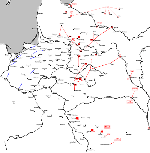 Вместе с тем он продолжал считать соединение двух русских армий невыгодным для себя и, соответственно, стремился помешать этому. И если бы войска Багратиона, двигаясь на север, все же не успевали присоединиться к армии Барклая, то через некоторое время они подверглись бы двойному удару, нанесенному какой-то частью главных сил и правофланговой группой. Причем этой группе, как указывалось в письме к Богарне, предписывалось идти вслед за Багратионом из Новогрода через Белосток.