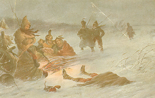 5) Биваки французские под Борисовым, сделанные из тел их товарищей, обоженных раскладенным в них огнем, от холода.