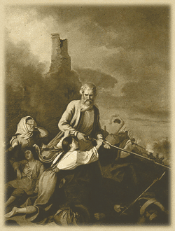 На другой день были собраны на площади русские пленные и раненные. В числе их были два майора, один по фамилии Кирилов, другого имя забыл. Когда Кирилов, раненный, дополз до лужи и опустил туда свои раненные ноги, тогда подошел к нему француз, обшарил его, взял часы, кошелек и сорвал с него орден св. Георгия 4-й ст.; но, по усиленной просьбе, возвратил ему крест и Кирилов спрятал его за галстук. Этот рассказ слышали мы от него самого. Оба майора выздоровели; им сшили коричневого цвета сюртуки с красными воротниками. Кирилов щеголял беспрепятственно в своем ордене. Они познакомились и посещали часто кружок приверженных законному правительству жителей, в числе коих был и мой отец. Кирилов в особенности любил и баловал меня, как смелого мальчика.