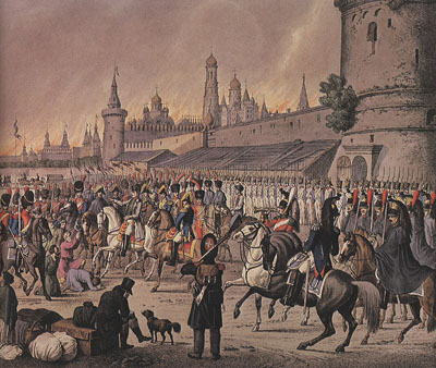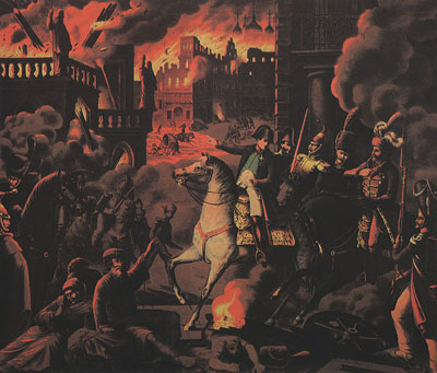 «Вот башни полудикие говорил впоследствии английский поэт, обращаясь к тени завоевателя. Всего девяносто километров отделяют Москву от Бородинского поля — целая неделя прошла между кровавым днем 7 сентября 1812 года и тем моментом, когда 14 сентября кавалерия Мюрата вступила на окраину Арбата. Однако уже в Бородинском сражении невидимо, но могущественно участвовал великий город. Москва участвовала теми чувствами тайного гнева, патриотической обиды, жажды справедливого отмщения, которые переполняли сердца бойцов и которые дали в эти грозные часы русскому народу полную нравственную победу над Наполеоном. Близкая угроза Москве воодушевляла этими чувствами русских героев, погибавших на Багратионовых флешах, на батарее Раевского, у Колоцкого монастыря. Не «суеверие», о котором твердили Наполеону придворные льстецы, повторявшие этот пренебрежительный отзыв своего повелителя, но могучее народное чувство любви к родине, олицетворяемой в эти часы Москвой, — вот что сделало Бородино самым страшным из всех бесчисленных битв кровавой наполеоновской эпопеи, по отзывам старого императора. Ведь Пушкин и дает объяснение, почему Наполеон «не предузнал» «великодушного пожара»: «Как сердца русских не постигнул ты с высоты отважных дум?» — вопрошал наш поэт Наполеона. Только когда уже бушевал зажженный со всех четырех концов великий город, Наполеон, судя по вырвавшимся у него замечаниям о «решимости» людей, сжигающих свою столицу, понял, что эти «скифы», эти «варвары» одушевлены кое-какими другими чувствами, посильнее всякого «суеверия». От начала до конца своего пребывания в Москве, от Дорогомиловской заставы, где он ждал 14 сентября каких-то несуществующих «бояр» с ключами от Кремля, и до той минуты 19 октября, когда он воскликнул: «В Калугу! И горе тому, кто станет на моем пути!» — Наполеон переходил от нетерпеливого и тщетного ожидания ответа Александра на его мирные предложения к поискам выхода из катастрофического положения, в которое поставил его пожар Москвы. Этот пожар имел для агрессора и его армии роковые последствия не только в смысле уничтожения запасов, но и в моральном отношении. Случилось именно то, чего так желал избежать Наполеон, усиленно и многократно настаивая (уже в дни похода), что он, мол, ведет войну вовсе не затем, чтобы покуситься на территорию и достоинство России, а только затем, чтобы разрешить некоторые разногласия и дипломатические недоразумения. Пожар Москвы, подмосковная партизанщина, абсолютное отсутствие даже со стороны кучки нищего, оборванного люда, оставшегося в Москве, каких-либо признаков желания сблизиться с неприятелем — все это ясно говорило завоевателю, что эта война становится для России войной народной в самом полном, в самом беспощадном значении этого слова. Так оно и оказалось, и в несравненно больших размерах, чем это представлялось Наполеону. Истинный представитель русского народа в 1812 году, Кутузов и умом своим и своим безошибочным национальным инстинктом понял, что Москва погубит, а не спасет Наполеона. Царь и придворные не понимали этого и всячески порочили старого вождя. И поразительна также ни на минуту не пошатнувшаяся уверенность народной массы в тылу и солдат в армии, что пожертвование Москвой, как оно ни болезненно, совершенно необходимо. Всенародная популярность Кутузова н
