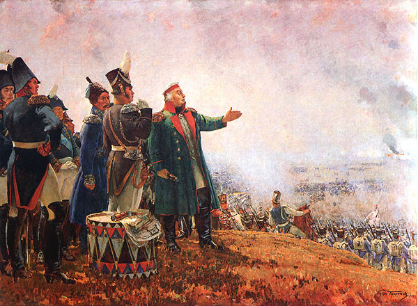 Пятнадцать часов длилась битва, и все это время Кутузов находился на своем командном пункте у деревни Горки. На картине рядом с ним - Ф. П. Уваров и М. И. Платов. Поодаль - А. П. Ермолов, М. Б. Барклай де Толли, Л. Л. Беннигсен. Кутузов отдает приказ Уварову и Платову совершить рейд в тыл и на левый фланг противника с тем, чтобы отвлечь внимание неприятеля от центра и левого фланга русских войск.