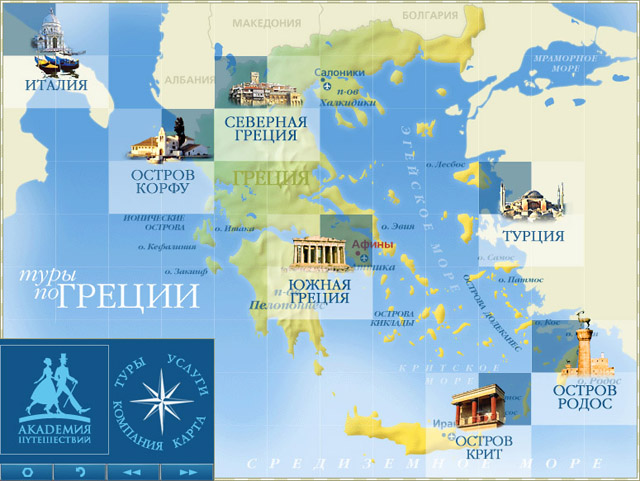 Диск «Туры по Греции» рассказывает о компании «Академия Путешествий», ее миссии и стратегии. Красочная презентация туров по курортам Греции знакомит с предоставляемыми услугами и позволяет выбрать оптимальный вариант отдыха.