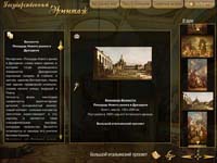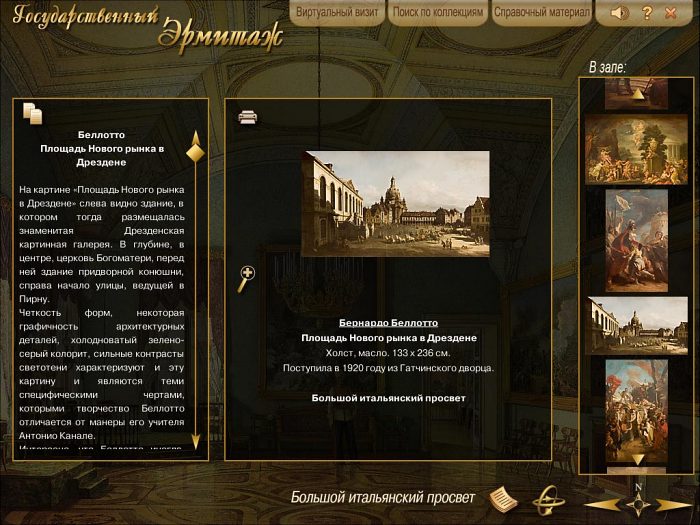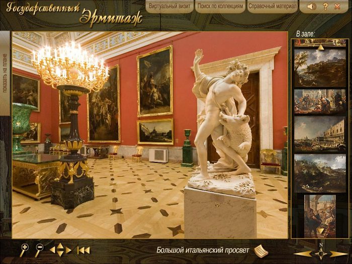 Виртуальный визит в Государственный Эрмитаж включает в себя трехмерную реконструкцию залов с возможностью самостоятельно выбирать маршруты осмотра и обширную базу данных по коллекциям, содержащую не только изображения произведений искусства (картин, скульптуры, мебели, фарфора, тканей и археологических памятников), но и обильный справочный материал по самим произведениям и их авторам.