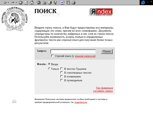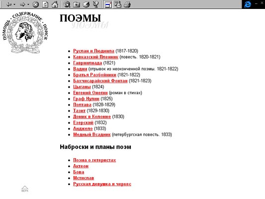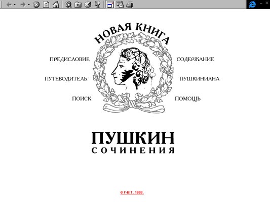 Электронное издание на основе Полного собрания сочинений Пушкина, изданного Академией Наук СССР. Кроме произведений на диске представлены дополнительные материалы, собранные в двух разделах. "Путеводитель" содержит 3500 статей, поясняющих огромное количество терминов и мифологических имен, которые Пушкин использовал в своем творчестве. В «Пушкиниану» включены стихи, речи, очерки, статьи и рассказы русских писателей о Пушкине, а также звукозаписи избранных произведений Пушкина в исполнении известных артистов. Электронное издание дает возможность искать произвольное слово или фразу по всем текстам, причем поиск ведется с учетом морфологии русского языка.