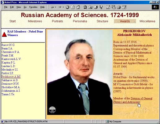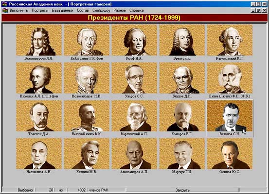 На компакт-диске представлены приветствие президента Российской Академии наук, фотопортреты членов Академии за 275-летний период ее существования (свыше 4500 оригинальных фотографий), краткий исторический очерк и организационная структура Российской Академии наук, ее отделения, институты, региональные отделения и научные центры. На диске имеется карта Российской Федерации с указанием местонахождения региональных отделений РАН и научных центров Академии. Приведен полный список институтов и научных журналов, издаваемых РАН, с указанием адресов и телефонов. Диск содержит реляционную базу данных с полным перечнем действительных членов, членов корреспондентов, иностранных членов и почетных членов РАН, начиная с момента ее образования и до настоящего времени, с указанием научной специализации, года избрания, отделения и кратких биографических данных. Приведен полный список присуждаемых Академией золотых медалей и премий имени выдающихся ученых, и список ученых, удостоенных этих наград. Представлен персональный состав и портреты членов Президиума РАН и действующий состав Российской Академии наук (по состоянию на 31 марта 1999 года). Включены некоторые статистические сведения о Российской Академии наук. Диск содержит слайд-шоу общей продолжительностью более 8 часов и свыше 2 часов музыкального сопровождения.