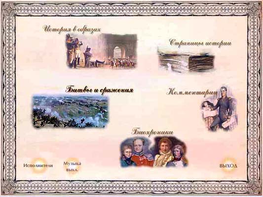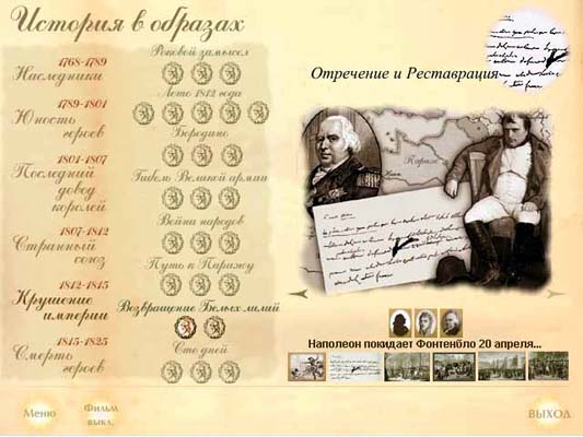 Среди десятков знаменитых монархов и министров, генералов и революционеров конца XVIII - начала XIX вв. не было равных двум вершителям судеб человечества - российскому императору Александру I и императору французов Наполеону Бонапарту. В период их правления Россия и Франция оказывали огромное влияние на общую ситуацию в Европе. Действие, представленное на диске в виде 96 интерактивных сюжетов-постановок, общей продолжительностью более 3-х часов, разворачивается на сцене, которой является практически вся Европа. Захватывающая грандиозная дуэль главных героев этих постановок, в которых принимают участие более 200 других действующих лиц - членов семей императоров, политических деятелей, военачальников, революционеров, деятелей культуры и просвещения наложила печать на всю историю XIX столетия. Версии: русская, английская. Диск включает: 96 постановочных сюжетов, около 1000 изображений гравюр, рисунков и произведений живописи, более 200 статей, карты, линии времени, анимационные представления четырех важнейших сражений, 30 минут музыки П.И.Чайковского, более 3-х часов речевого сопровождения. Текст читает В.Лановой. Музыкальное сопровождение в исполнении оркестра под управлением В.Дударовой.