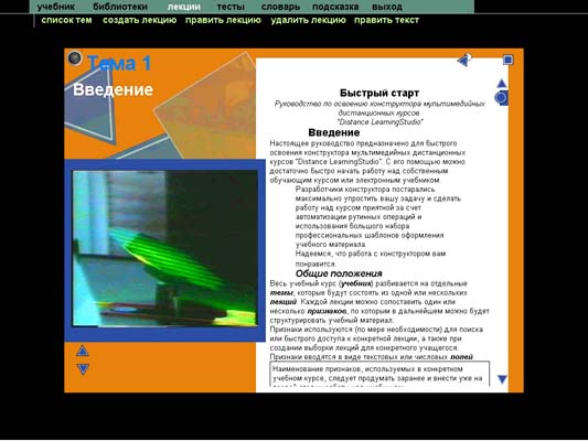 Обучающая и образовательная программа. Высокоуровневое авторское средство - конструктор мультимедийных дистанционных образовательных курсов и электронных учебников, ориентированное на преподавателей высших и средних учебных заведений. Конструктор обеспечивает создание всех компонент учебных курсов: мультимедийных лекций, интерактивных систем тестирования, средств общения и “Учебного центра” – сайта образовательного учреждения. Максимальная автоматизация работ, большое количество шаблонов и библиотек, а также упрощенный интерфейс делают этот продукт доступным для работников области образования, медицины, социологии и других на уровне простого пользователя.