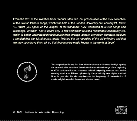 песни, записанные Ю. Энгелем – одним из признанных лидеров еврейского музыкального возрождения России начала XX века. Записи сделаны на восковых цилиндрах при помощи фонографа Эдисона во время проведения первой еврейской этнографической экспедиции под руководством С.Ан-ского в местечках Киевской губернии (Ружин, Сквира, Паволочь) в 1912 году. Фонографические цилиндры с записями всей «Исторической коллекции еврейской музыки 1912-1947гг» (в том числе и «Материалы этнографической экспедиции Ю.Энгеля 1912 г.») хранятся в Национальной библиотеке Украины им. В.И.Вернадского. Высококачественное воспроизведение звука с фонографических цилиндров и запись на современные носители информации осуществлены на оборудовании и по технологии, разработанным в Институте проблем регистрации информации НАН Украины.Разработка метода и оборудования для воспроизведения звука с фонографических цилиндров Эдисона, перезапись фонограмм на современные носители информации, Институт проблем регистрации