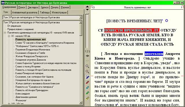 Русская литература от Нестора до Маяковского» — это систематизированное собрание русской литературы от XI до 20-х годов XX в. объемом более 100 тысяч страниц на одном электронном носителе. Это переработанное и значительно расширенное переиздание "Антологии русской литературы". Диск содержит памятники древнерусской литературы XI – XVII веков в ее различных жанрах: летописи (начиная с «Повести временных лет» Нестора), жития, сказания и др., а также произведения более 120 писателей и поэтов XVIII – XX веков: проза, стихотворные и драматические произведения, критические статьи. Художественные тексты сопровождаются биографиями и портретами авторов.