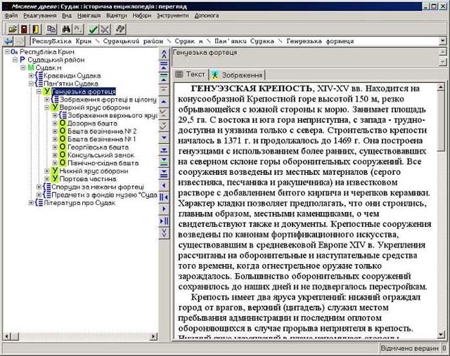 База данных содержит энциклопедические сведения о Судаке - древнем городе на юго-востоке Крымского полуострова. Основанный византийцами в 6 ст. н.э., город прожил долгую бурную жизнь, которая отразилась в его памятниках. Наивысшего расцвета город достиг в 14 - 15 вв. при правлении генуэзцев, когда самая богатая и уважаемая корпорация московских купцов звалась "сурожанами", то есть купцами, которые вели торговлю с Судаком. От этого времени хорошо сохранились оборонительные сооружения большой крепости, которые являются оснвной достопримечательностью Судака. База содержит также сведения о других памятниках архитектуры и археологии города. База данных содержит 1006 документов, 12 авторских листов текста, 851 изображение.