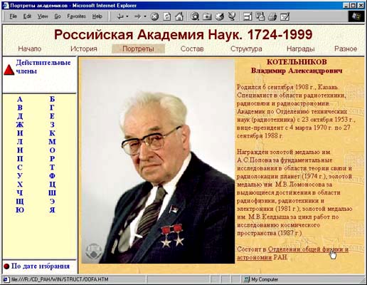 На компакт-диске представлены приветствие президента Российской Академии наук, фотопортреты членов Академии за 275-летний период ее существования (свыше 4500 оригинальных фотографий), краткий исторический очерк и организационная структура Российской Академии наук, ее отделения, институты, региональные отделения и научные центры. На диске имеется карта Российской Федерации с указанием местонахождения региональных отделений РАН и научных центров Академии. Приведен полный список институтов и научных журналов, издаваемых РАН, с указанием адресов и телефонов. Диск содержит реляционную базу данных с полным перечнем действительных членов, членов корреспондентов, иностранных членов и почетных членов РАН, начиная с момента ее образования и до настоящего времени, с указанием научной специализации, года избрания, отделения и кратких биографических данных. Приведен полный список присуждаемых Академией золотых медалей и премий имени выдающихся ученых, и список ученых, удостоенных этих наград. Представлен персональный состав и портреты членов Президиума РАН и действующий состав Российской Академии наук (по состоянию на 31 марта 1999 года). Включены некоторые статистические сведения о Российской Академии наук. Диск содержит слайд-шоу общей продолжительностью более 8 часов и свыше 2 часов музыкального сопровождения.