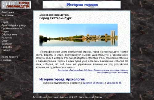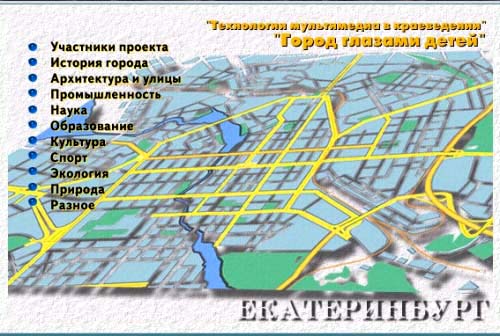 Диск "Город глазами детей" — визитная карточка города Екатеринбурга, сделанная учащимися под руководством педагогов к 275-летию нашего города. Этот диск является результатом образовательного проекта "Мультимедийные технологии в образовании", который был организован Центром новых информационных технологий в 1997-98 году. В рамках этого проекта учащиеся, используя нетрадиционные формы работы по сбору и подготовке материалов, познакомились с культурным наследием города Екатеринбурга, с его историей, достопримечательностями, промышленным потенциалом. Информация, представленная на диске, очень разнообразна - здесь есть сведения об учебных заведениях, средствах связи, учреждениях культуры, парках, многочисленных музеях и даже зоопарке. Диск может стать путеводителем по Екатеринбургу и представляет ценность не только для жителей города, но и для его гостей. Работа эта уникальна, и аналогов ей нет нигде.