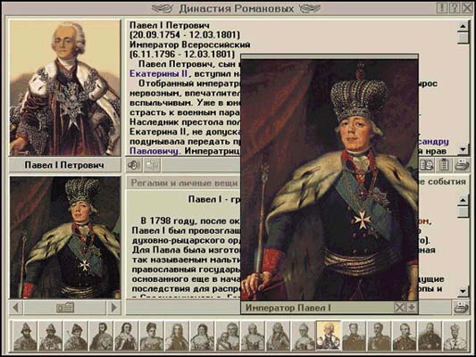 Триста четыре года правила в России династия Романовых. Восемнадцать царей и императоров подчас единолично решали судьбу огромного государства. Личная жизнь правителей России, реформы и преобразования, войны, походы, территориальные приобретения и потери Российской империи – обо всем этом, а также еще о многом другом Вы узнаете, посмотрев наш CD–ROM. Значительная часть диска посвящена дошедшим до нас вещам, которые некогда принадлежали русским монархам. Вы увидите государственные регалии, одежду, драгоценную утварь и посольские дары, хранящиеся в Оружейной палате Московского Кремля. Мы подобрали для Вас картины, посвященные ключевым моментам русской истории, портреты государственных деятелей и членов Российского императорского Дома. 800 статей. Регалии. Современники. Хронология исторических событий. 30 минут видео.