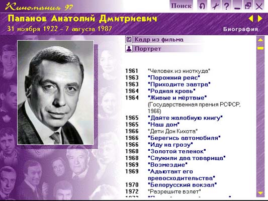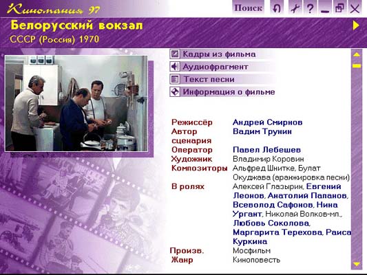 Энциклопедия российского киноискусства. Более 4200 статей об отечественных фильмах, снятых в период с 1908 по 1996 год. 550 биографий и фильмографий российских актеров, режиссеров, операторов, художников и композиторов. 54 кинофрагмента из самых известных картин и монтажные листы к ним. Статьи по истории кино.