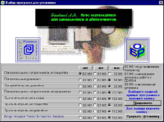 Компьютерная подготовка к экзаменам по математике на основе решения реальных экзаменационных задач. 225 задач - интерактивное решение, 450 задач - самостоятельное решение. Полная теория, гипертекстовый учебник с доказательством всех формул, тождеств и теорем, комментариями и иллюстрациями. 2 учебника - теория, методы решения задач, задачники, таблицы формул и графиков.