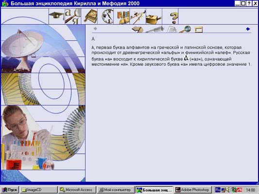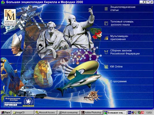Большая Энциклопедия Кирилла и Мефодия 2000 (БЭКМ) - четвертая версия энциклопедии. В БЭКМ содержит самую разнообразную информацию о новейших научных открытиях и технических изобретениях, о государственных и политических деятелях, о выдающихся представителях отечественной и зарубежной культуры, о древнейших цивилизациях, религиях, мыслителях древности, о создателях космической и компьютерной техники, о течениях современной моды и популярной музыки, о крупнейших событиях современности, а также последние статистические данные со всего мира и многое, многое другое. В состав энциклопедии входит 4 видеоприложения на 5 отдельных дисках. Диск 3: "Наука и техника. Физические процессы". Диск 4 и 5: "Жизнь диких животных". Диск 6: "Видеоархив российской истории". Диск 7: "Медиа-мозаика".