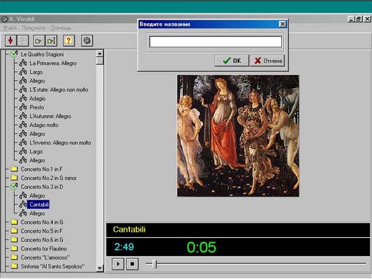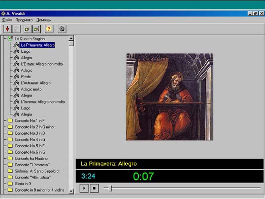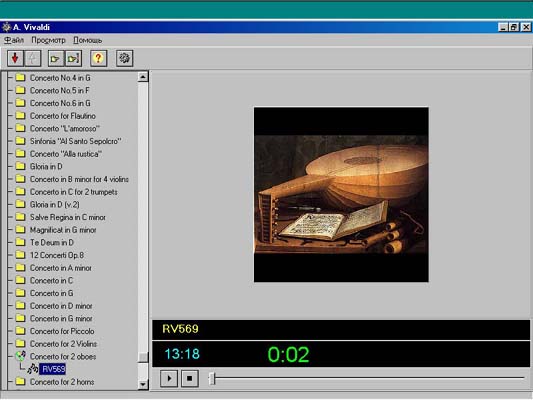 На диске помещено полное собрание музыки Антонио Вивальди в сопровождении иллюстраций классических произведений искусства. 9 часов идеального звука. Возможен поиск музыкального произведения по его названию, выбор любой части музыкального произведения.