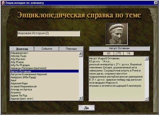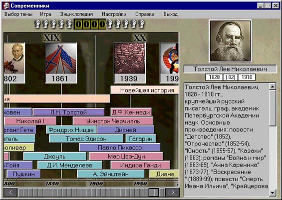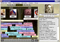 Оригинальное графическое представление исторического процесса в виде непрерывной цепочки выдающихся личностей 27 веков позволяет по-новому взглянуть на историю. Помимо портретов и биографий исторических деятелей, можно также наглядно увидеть их "историческое окружение". А наличие азартной игры помогает запомнить сотни исторических деятелей и событий, что наверняка поможет в подготовке к экзаменам в школе.