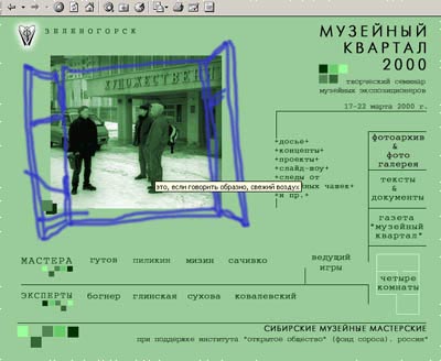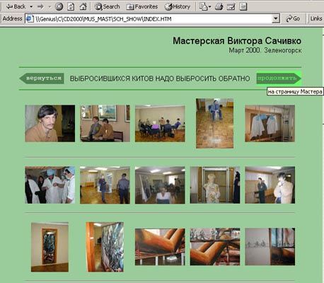 CD-ROM представляет собой каталог материалов, заархивировавших событие "Музейные мастерские", происходившее в г. Зеленогорске 17-21 марта 2000 г. CD-ROM содержит электронные версии текстов газеты "Музейный квартал", цифровые фотографии, запечатлевшие Музейные Мастерские в Зеленогорске. Авторы попытались остаться в виртуальном пространстве, создав в нем экспозицию "Единица/нуль хранения", которая, по сути, состоит из нулей и единиц компьютерного кода, законсервировавших Следы события. Экспозицию можно развернуть на столе для одного-двух зрителей, можно показать и для нескольких десятков, используя проекционное оборудование. Она - нечто среднее между учебно-методическим пособием и отраслевым журналом, что предполагает внимательное чтение или даже исследование. В экспозиции использованы материалы, которые шли след в след за Событием, превращаясь в его Следы.
