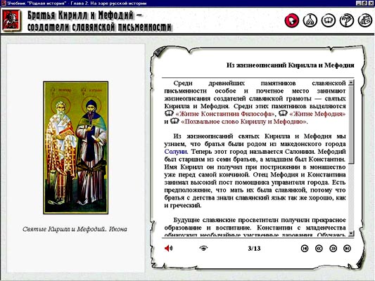 Мультимедиа-учебник охватывает исторический период от первых упоминаний о славянах до свержения ордынского ига и сочетает информационную насыщенность, обширный изобразительный ряд и простой, удобный пользовательский интерфейс. Мультимедиа-учебник создан на основе авторского учебника Н.Г. Гореловой и Б.И. Пивоварова.