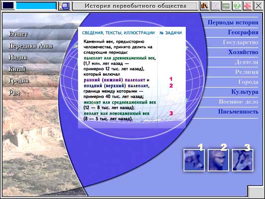 Этот диск содержит 40 задач по истории Древнего мира. Компьютерная задача по истории – это не форма проверки заданий, а увлекательный способ их приобретения. В поисках ответа на поставленный вопрос вы погружаетесь в творческую атмосферу работы историка. Сотни экранов программы содержит фрагменты трудов историков Древней Греции и Китая, выразительные строки известных и безымянных поэтов Древнего Рима и Египта, комментарии современных ученых. Вы увидите множество фотографий знаменитых памятников искусства, архитектуры, пейзажей известных исторических мест. Работа с программой напоминает игру, но результат этой игры – серьезные исторические знания. Первобытное общество. Передняя Азия. Египет. Индия. Китай. Греция. Рим.
