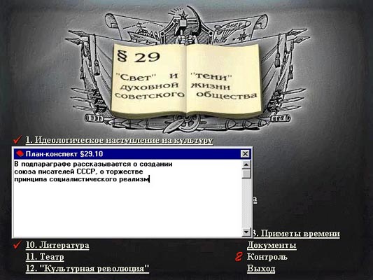 Компьютерный мультимедиа учебник истории - это учебное издание нового типа (самое большое российское мультимедийное издание), состоящее из 4-х компакт-дисков и брошюры. Учебник создан в сотрудничестве с авторами базовой школьной учебной книги А.А. Даниловым и Л.Г. Косулиной. Компьютерный учебник содержит 278 мультимедийных лекций и позволяет резко облегчить усвоение обширного материала за счет комплексного воздействия видеоряда, звука (музыка, шумы, более 24 академических часов дикторского текста), а также чисто компьютерных возможностей - диалога с учеником, автоматизированного контроля усвоения пройденного материала. Изучение каждого параграфа заканчивается тестированием (более 600 тестов, кроссвордов и т.п.). В результате программа формирует "классный журнал" с оценками учащихся и выявляет плохо усвоенные лекции, которые придется прослушать еще раз перед повторным тестированием, если ученик претендует на более высокую оценку. Предусмотрены и развлекательные моменты, стимулирующие интерес учащихся (юмористический сериал "Экзамен", призы для отличников - озвученные и иллюстрированные исторические анекдоты). Учебник снабжен обширным справочным материалом: более 700 персоналий важнейших политических и общественных деятелей, деятелей науки и культуры; подробную хронологию; терминологический словарь; более 30 анимированных карт; более 6 тысяч иллюстраций (редких фотографий, плакатов, картин, рисунков, схем, диаграмм); более двух часов озвученной кинохроники; более 500 документов; более 70 уникальных фонограмм - звуковых документов (речей политических деятелей, наиболее популярных песен разных лет и т.п.). Данное издание одновременно заменяет и учебник, и рабочую тетрадь, и атлас, и хрестоматию, и справочник, и учебный видеофильм. Более того, оно во многом заменяет и преподавателя, высвобождая время последнего для индивидуальной работы с учениками. Программа содержит удобную полнотекстовую поисковую систему, позволяющую использовать настоящее издание в качестве исторической энциклопедии. Компьютерный учебник одобрен федеральным экспертным советом, рекомендован к изданию Министерством общего и профессионального образования РФ, включен в федеральный комплект учебников. Он был отмечен первой премией на выставке обучающих программ ИТО-98. Кроме того, учебник одобрен московским бюро ЮНЕСКО. НАЗНАЧЕНИЕ УЧЕБНИКА. Учебник полностью основан на существующих школьных программах и ориентирован на учащихся трех возрастов (три уровня сложности): 1) на 9-й класс - первый концентр; 2) на 10-11-й классы - второй концентр (больший объем учебного материала и более жесткий тестовый контроль знаний); 3) на абитуриентов исторических факультетов и студентов неисторических факультетов вузов (ряд более сложных и специальных материалов, а также значительно больший объем документов, предназначенных для самостоятельного изучения и анализа). Учебник в равной степени предназначен для использования как дома (для самостоятельных занятий на домашнем компьютере), так и в школе, гимназии, лицее, колледже, институте (для занятий в компьютеризированном классе). Он удобен и для дистанционного обучения, особенно для малокомплектных школ, институтов, интернатов и т.д. Кроме того, учебник может быть полезен всем, кто интересуется историей России.
