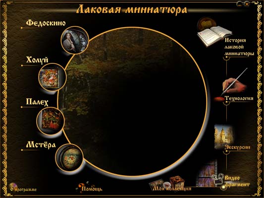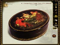 История русских народных промыслов была бы неполной без рассказа о лаковой миниатюре. Искусство, зародившееся тысячелетие назад на Востоке, приобрело в России уникальные национальные черты. Представляемый CD-ROM «Лаковая миниатюра» из серии «Русские народные промыслы» - это справочно-художественное издание, которое позволяет пользователю познакомиться с историей становления и сегодняшним днем одного из интереснейших видов прикладного народного творчества России. В диске представлен красочный материал о различных направлениях, школах и центрах лаковой миниатюры - Мстере, Палехе, Федоскино, Холуе; рассказано о ведущих мастерах; уникальных коллекциях произведений; техниках и стилях живописи. В составе издания: 5 обзорных лекций о различных направлениях искусства лаковой миниатюры; 120 иллюстрированных описаний уникальных экспонатов из музеев России и работ современных мастеров; 25 минут видео (видеофильм «Тебе, Россия, русский наш талант…», рассказывающий о мастерах Мстеры); 40 минут аудиокомментариев