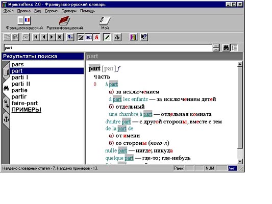 Французско-русский, русско-французский словарь. Впервые на российском рынке программных продуктов появляется французско-русский / русско-французский электронный словарь обшей лексики. МультиЛекс 2.0 Французский содержит "Новый французско-русский и русско-французский словарь" О. В. Раевской (М., "Русский язык", 1996), включающий 40 тыс. слов и словосочетаний во французско-русской и 60 тыс. - в русско-французской части. Особенность этого издания - наличие во всех словарных статьях французской фонетической транскрипции, что встречается далеко не часто и весьма полезно и удобно при обучении языку, особенно на начальных стадиях.
