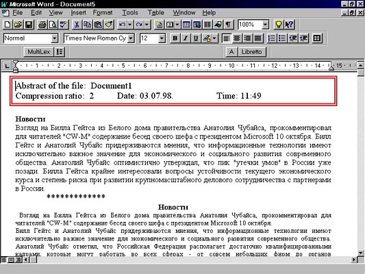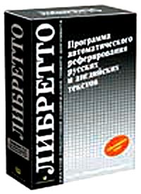 Программа для автоматического аннотирования документов Либретто - это средство автоматического аннотирования текстов на русском и английском языках, которое позволяет составлять связные, осмысленные аннотации документов любой сложности, объема и тематики. Благодаря Либретто пользователь может за несколько минут оценить важность документа, просмотрев его аннотацию. Либретто работает в двух основных режимах: аннотирования и выделения ключевых слов. Аннотирование производится с заданным коэффициентом смыслового сжатия, который регулируется пользователем. Пользователь также может указать относительный размер аннотации (или набора ключевых слов). Скорость автоматического аннотирования (выделения ключевых слов) составляет около 100 Кб в минуту. Либретто выполняется в среде текстового редактора Microsoft Word 6.0, 7.0, Microsoft Office 97 и работает с любыми форматами документов, поддерживаемыми данными редакторами.