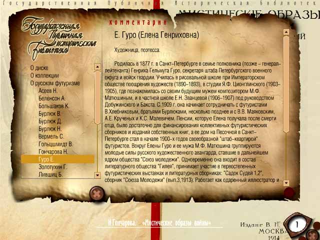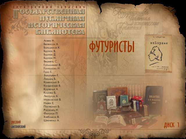 CD-ROM "Футуристы", первый диск из серии "Электронный запасник Государственной Публичной Исторической библиотеки", представляет собой электронные версии книг футуристов 1912-1930 гг. Доступ читателей к оригиналам этих книг ограничен или полностью закрыт.
