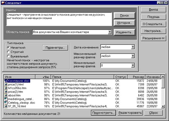 Программа для смыслового поиска документов на русском, английском и немецком языках "Следопыт" - это средство для быстрого и удобного поиска документов по смыслу на персональном компьютере или во всей локальной сети. Следопыт осуществляет поиск текстов на русском, английском и немецком языках. Поиск производится по запросу на естественном языке, что позволяет задавать вопросы так, как если бы они задавались человеку. Следопыт находит документы по смысловой близости, слова запроса отыскиваются во всех грамматических формах, более того, Следопыт находит нужный документ, даже если тема запроса выражена в нем другими словами. Найденные документы автоматически располагаются по степени соответствия запросу, все слова, указанные в запросе, подсвечиваются в тексте. Скорость поиска составляет около 35 Мб в минуту. Интеграция с Microsoft Word 6.0, 7.0 позволяет использовать в виде запроса выделенные фрагменты в документах Word, а также мгновенно загружать найденные тексты в Word для редактирования. Следопыт просматривает файлы форматов Microsoft Word 2.0, 6.0, 7.0, ASCII, HTML.