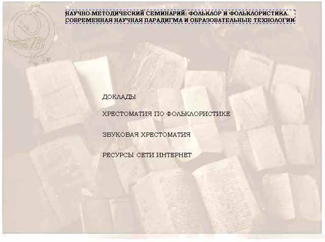 Предметом разработки междисциплинарного семинара служит пакет учебных пособий нового поколения, которые должны обеспечить потребности Российского образования в учебных материалах по русскому фольклору, представляющих современную научную и методическую структуру предмета, содержащих наиболее актуальные классические и современные работы по фольклору в виде хрестоматии, а также обеспечивающих учебный процесс электронным приложением, представляющим жанры русского фольклора в звучащем виде. Разделы диска: "Доклады" - электронные версии докладов, прочитанных в рамках семинария. "Хрестоматия по фольклористике" - библиография к докладам, наиболее значимые научные статьи авторов докладов. "Звуковая хрестоматия" - фольклорные аудиозаписи в формате mp3 с текстовыми расшифровками."Ресурсы сети Интернет" - подборка ссылок на гуманитарные сетевые ресурсы.