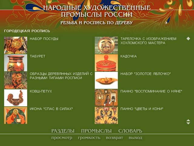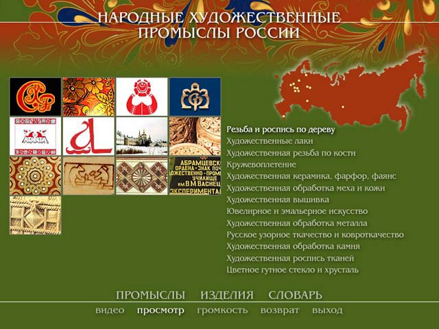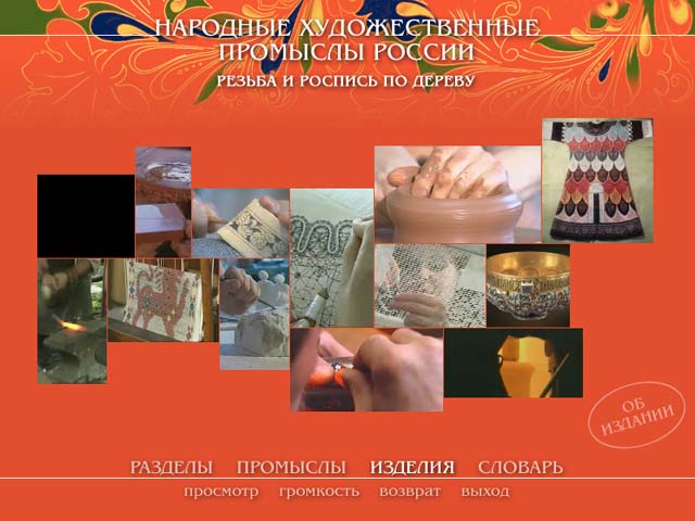 На диске представлены традиционные народные художественные промыслы России. Резьба и роспись по дереву и ручная роспись тканей, единственная в своем роде лаковая миниатюра на шкатулках из папье-маше, легчайшее нитяное кружево и тонкое кружево из металлической проволоки, старинное ткачество, хрупкая резьба по кости и ажурная – по бересте, сохранившееся до наших дней искусство стеклодувов и алмазчиков, ручная роспись фарфора. Вы узнаете интересные факты из истории этих промыслов и сможете рассмотреть работы современных мастеров.