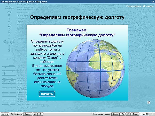 Уроки географии Кирилла и Мефодия. 6 класс» содержат: ,61 урок по курсу ,более 780 рисунков, фотографий и трехмерных моделей, ,около 200 карт, ,около 100 анимаций ,29 видеофрагментов, ,54 интерактивных тренажеров ,более 500 тестов ,более 150 проверочных заданий ,более 560 терминов и понятий в справочнике, ,экзамен по курсу ,многократное прохождение одной и той же темы и урока ,тестирование по темам и урокам ,дневник успеваемости ,копирование и печать энциклопедических статей и иллюстраций