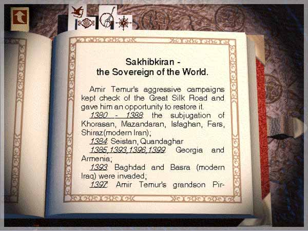 Мультимедиа-энциклопедия «АМИР ТЕМУР: Личность, Государство, Ренессанс» посвящена Великому Амиру Темуру, его Личности, Государству и эпохе Ренессанса. Подготовлена на узбекском, русском и английском языках. /Содержание: 400 информационных блоков, 200 фотоиллюстрации, 10 классической музыки, интерактивная электронная карта государства Амира Темура/. Разделы CD:• Личность Амира Темура • Видео и анимации • Государство Амир Темура • Фотоиллюстрации • Народное мастерство • Градостроение • Справочник • Аудио записи • Интерактивная карта.