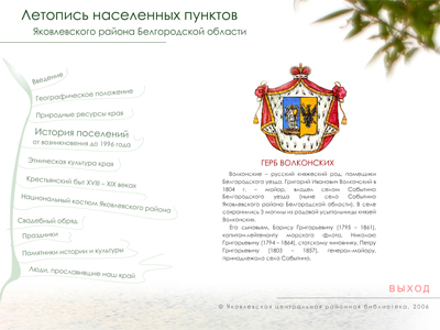 Диск содержит сведения о природных ресурсах и экологии Яковлевского района, историю поселений с периода их образования до 1996 года, информацию о памятных истории и культуры, людях, прославивших край. Дано также описание крестьянского быта XVIII-XIX веков.