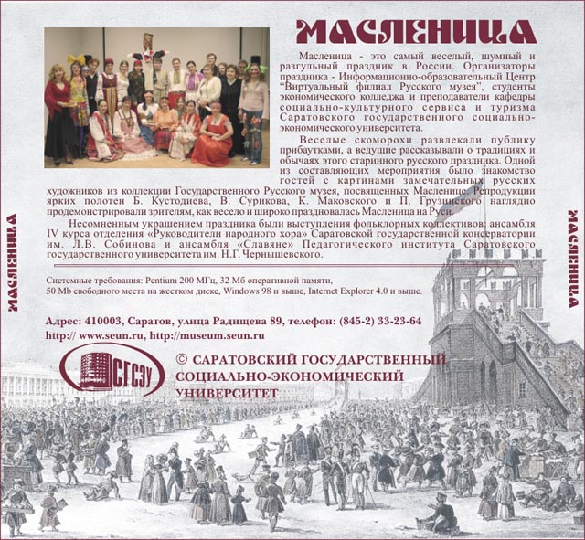 Масленица – это один из самых веселых, шумных и разгульных праздников в России. Организаторы праздника – Информационно-образовательный центр «Виртуальный филиал Русского музея», студенты экономического колледжа и преподаватели кафедры социально-культурного сервиса и туризма Саратовского государственного социально-экономического университета (СГСЭУ).