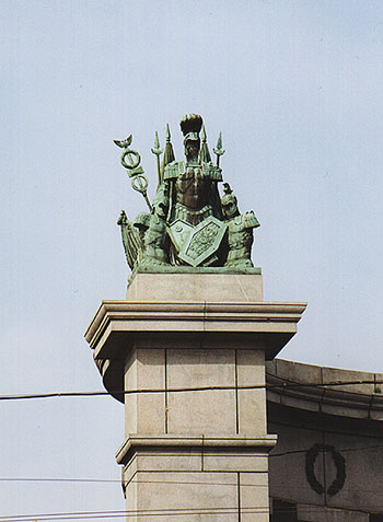 Decorative pyramids of ancient military armours and banners, crowing the colonnade of the Doric Order.