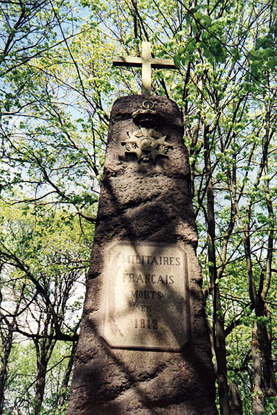 The memorial is tetrahedral stele on the pedestal with the cross above. On the front side is the sign of the Legion d'Honer and two plates. At the upper one "Militaires francais mort en 1812" is carved , and the lower informs that the memorial has been installed in 1889 at the 75th anniversary of war. There are the stones with the inscription "Militaires francais mort en 1812" at all four sides of the memorial. The fence of the memorial is the eight gun tubes dug into the ground and joined by chain.
