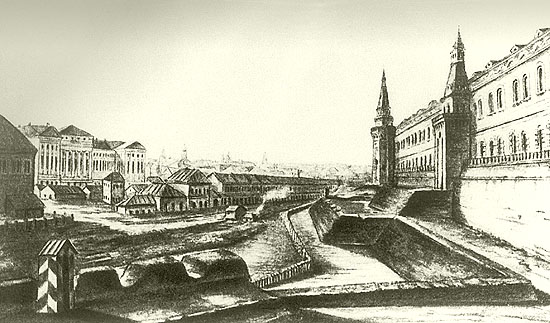«Мы учились как должно, шалили как можно...» Учебный процесс, отношения между попечителем, профессорами и студентами представляли собой лишь одну сторону жизни Московского университета. К другой стороне, не менее важной, но довольно слабо изученной исследователями, относятся все элементы городской среды, окружавшей воспитанников университета за пределами аудиторий, бытовые условия их проживания и учебы, характерные детали поведения, привычки и общие интересы студентов, дружеские беседы, круг чтения, отдых и развлечения в свободное время. Реконструировать повседневную жизнь московского студенчества помогают нам различные дошедшие до нас документы, связанные с самими студентами, дневники, переписка, позднейшие мемуары. В результате вырисовывается богатая яркими красками и весьма пестрая картина. Главное здание университета на Моховой и окружавшая его территория, где располагались еще несколько учебных и жилых помещений, вместе составляли целый «университетский» квартал Москвы. Этот участок достался университету не сразу, он собирал его по частям и даже по мелким кусочкам около пятидесяти лет. К 1804 году территория университета уже включала в себя бывшие владения семи барских усадеб, двух церковных погостов с дворами церковнослужителей и один переулок вдоль Моховой улицы, а также занимала всю линию по Тверской между Долгоруковским и Газетным переулками, где размещался университетский благородный пансион (сейчас на его месте находится здание Центрального Телеграфа). С последней четверти XVIII века по мере роста владений университета вдоль Моховой сюда из первого здания – у Воскресенских ворот на Красной площади – постепенно перемещается вся университетская жизнь. Этот процесс завершается в 1793 году с окончанием строительства главного корпуса, возведенного по проекту архитектора М.Ф.Казакова. Подробные воспоминания о допожарном здании университета оставил И.Ф.Тимковский, учившийся здесь в 1790–е годы, и в приводимом здесь описании мы последуем за его рассказом. Главное здание университета представляло собой дом в четыре этажа, с передним двором и боковыми корпусами, обращенный к Моховой улице. Передний двор содержался чистым, а у входных ворот стоял караул. Нижний этаж занимали службы, погреба, кладовые, кухни и запасы для казенных учеников. Помимо главного парадного входа с колоннами имелось два других – у ворот в боковых корпусах. С задней стороны также был вход в середине и два малых — по углам (они вели в жилые комнаты учеников и студентов на втором этаж,.а центральный вход из больших сеней – по задним лестницам на третий и четвертый этажи). На третьем этаже в середине над передними сенями находилась круглая двусветная зала для торжественных заседаний (т.н. Большая аудитория), с хорами на четвертом этаже. Направо и налево от залы по фасаду находились в вытянутых галереях университетская библиотека и музей естественной истории. Параллельно этим помещениям с тыльной стороны третьего этажа, окнами на задний двор располагались справа три залы для математики, физики и физического кабинета, а слева – залы для искусств: рисования, музыки, танцев и фехтования. Под этими аудиториями во втором этаже, со входом из больших задних сеней, находились столовые и комнаты для казенных учеников; в четвертом этаже над аудиториям