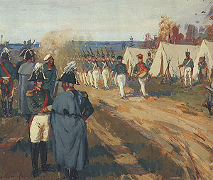 Сочинялись песни и в Тарутинском лагере. Тут сначала говорится, как «ночь темна была и не месячна, рать скучна была и не радостна» и как ратники «оплакивали мать родимую, мать-кормилицу, златоглавую Москву-матушку». Но тут же звучат и бодрые мотивы, ждут возобновления активных военных действий: «Не боимся мы французов, штык всегда востер у нас, лишь бы батюшка Кутузов допустил к ним скоро нас!» Слышится предчувствие победы: «Постараемся все, ребятушки, чтобы сам злодей на штыке погиб, чтоб вся рать его здесь костьми легла, ни одна б душа иноверная не пришла назад в свою сторону». Об упомянутом выше свидании Кутузова с Лористоном именно тут, забегая вперед, уместно напомнить хоть в нескольких словах. В разгар работ по подготовке активных действий против выдвинутого вперед отряда Мюрата Кутузову доложили о приезде в Тарутинский лагерь специально командированного Наполеоном генерала маркиза (в некоторых документах он неточно назван графом) Лористона. Это была последняя из упорных и одинаково неуспешных попыток Наполеона войти в сношения с Александром и поскорее заключить мир. Провал первой попытки (с генералом Тучковым - третьим в Смоленске) и второй (с И. А. Яковлевым — в Москве) раздражал и смущал императора, привыкшего, чтобы у него просили мира, а не самому просить мира. Но положение на этот раз, в октябре, среди московского пожарища, было таково, что о самолюбии приходилось забыть. Наполеон сначала хотел послать к Кутузову Коленкура, долго бывшего императорским послом при Александре, но Коленкур, при всей преданности Наполеону, отказался ввиду явной безнадежности попытки. Был позван Лористон, в свое время заменивший Коленкура на посольском посту в Петербурге. Лористон заикнулся было о том, что Коленкур прав, но тут Наполеон оборвал разговор прямым приказом: «Мне нужен мир, он мне нужен абсолютно, во что бы то ни стало. Спасите только честь». Лористон немедленно отправился к русским аванпостам. Вопрос о приеме Лористона и, главное, о предстоящем разговоре с ним был решен Кутузовым без всяких признаков колебаний, и только злобствовавший на Кутузова английский обершпион Роберт Вильсон мог подозревать Кутузова, что тот хочет, встретившись на аванпостах с глазу на глаз с Лористоном, войти с французами в мирные переговоры, без ведома и против воли царя и его союзников (Англии). Мы уже знаем по всем свидетельствам и по словам самого Кутузова, сказанным перед сражением под Красным французскому военнопленному Пюибюску, что главнокомандующий делал все возможное, чтобы подольше задержать Наполеона в Москве. Поэтому он нашел вполне целесообразным не только весьма вежливо принять Лористона, но и обещать ему отправить императору Александру все, что ему передаст Лористон. Это обеспечило прежде всего долгую проволочку. Пустить самого Лористона в Петербург Кутузов решительно отказался. По существу же ответ Кутузова не мог вызывать никаких недоразумений: никакой речи о мире с Наполеоном в данный момент быть не могло. На жалобы Лористона относительно обхождения русских крестьян с французами, попадавшими в их руки, фельдмаршал ответил, что русский народ «отплачивает французам той монетой, какой должно платить вторгнувшейся орде татар под командой Чингисхана». Эта мысль была повторена. Доклад вернувшегося от Кутузова в Кремль генерала Ло