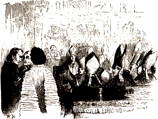 Крестины римского короля совершились 9 июня, в соборе Парижской Богоматери. Весь Париж сбежался смотреть императора. Народ хотел прочесть на радостном челе своего героя тайные наслаждения отца и монарха и показать ему свою собственную радость. Улыбка Наполеона, столь редкая и скоропреходящая на его строгом лице, на этот раз была очень заметна и отражалась на всех, толпившихся около свиты.