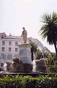 Летом Аяччо пуст и практически безлюден, трудно кого-либо встретить на улице. Жизнь города замедляется из-за жары, лишь вечерами оживает центральная площадь Фош. И приезжие, и местные жители собираются у фонтана. На карте он значится под названием «Фонтан четырех львов». Статуя Наполеона, изображенного в тоге на манер римского императора, гордо высится над площадью. А рядом ютятся мелкие магазинчики, где можно приобрести памятные сувениры, связанные с именем Наполеона. Хотите карманный бюст императора? Или игрушечных солдатиков Великой Армии с самим Маленьким Капралом во главе? Можно купить и почти настоящие документы эпохи Наполеона с его личной подписью и печатью.