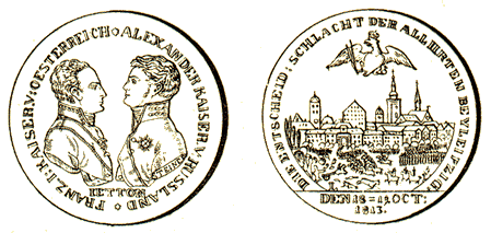 На это событие был отчеканен в Вене жетон *), на аверсе которого помещены два портрета в профиль один против другого; под ними: JETTON. Левый портрет изображает императора Александра I. Вокруг портретов круговая надпись: FRANZ I: KAISER. V: OESTERREICH * ALEXANDER KAISER. V: RUSSLAND *. На обрезе рукава портрета императора Александра I помещена фамилия венского гравера: STEINER.